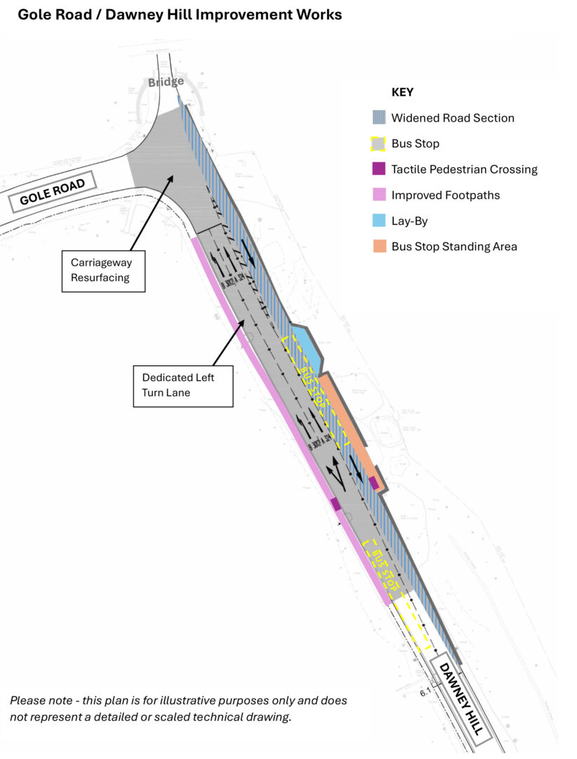 - A full closure of Dawney Hill and the Gole Road junction will occur Monday to Friday between 09:30 and 15:00, outside of school run hours to minimise disruption.