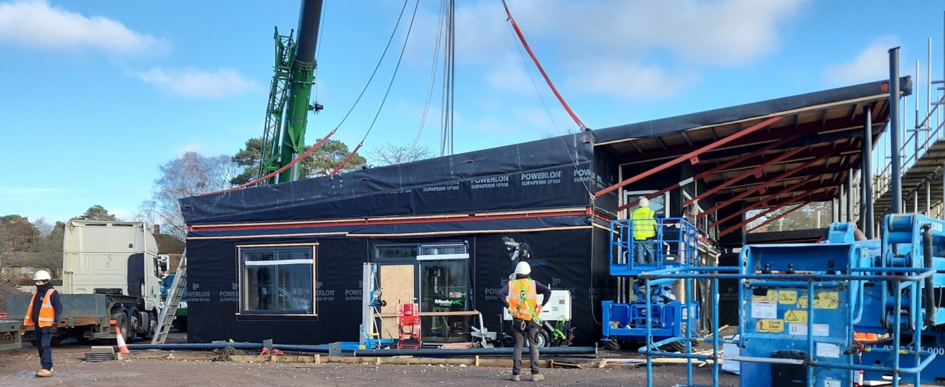 The Pavilion is made up of 16 structural steel modular bays, all manufactured off‑site and transported to Mindenhurst for installation. Using a modular construction has enabled faster progress on site and reduced disruption to the surrounding area. With the modules now in place, construction has moved into the next stages, with teams currently working on the external cladding and internal fit out.